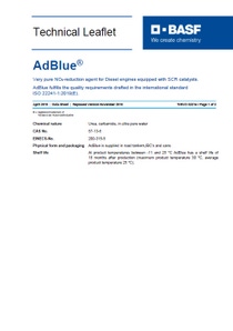 AdBlue® by BASF ist eine wässrige Lösung, die gemäß der entsprechenden europäischen Chemikaliengesetzgebung keine Gefahr darstellt. Ferner wird es gemäß der entsprechenden Gefahrgutvorschriften und Transportbestimmungen nicht als gefährliche Substanz klassifiziert.