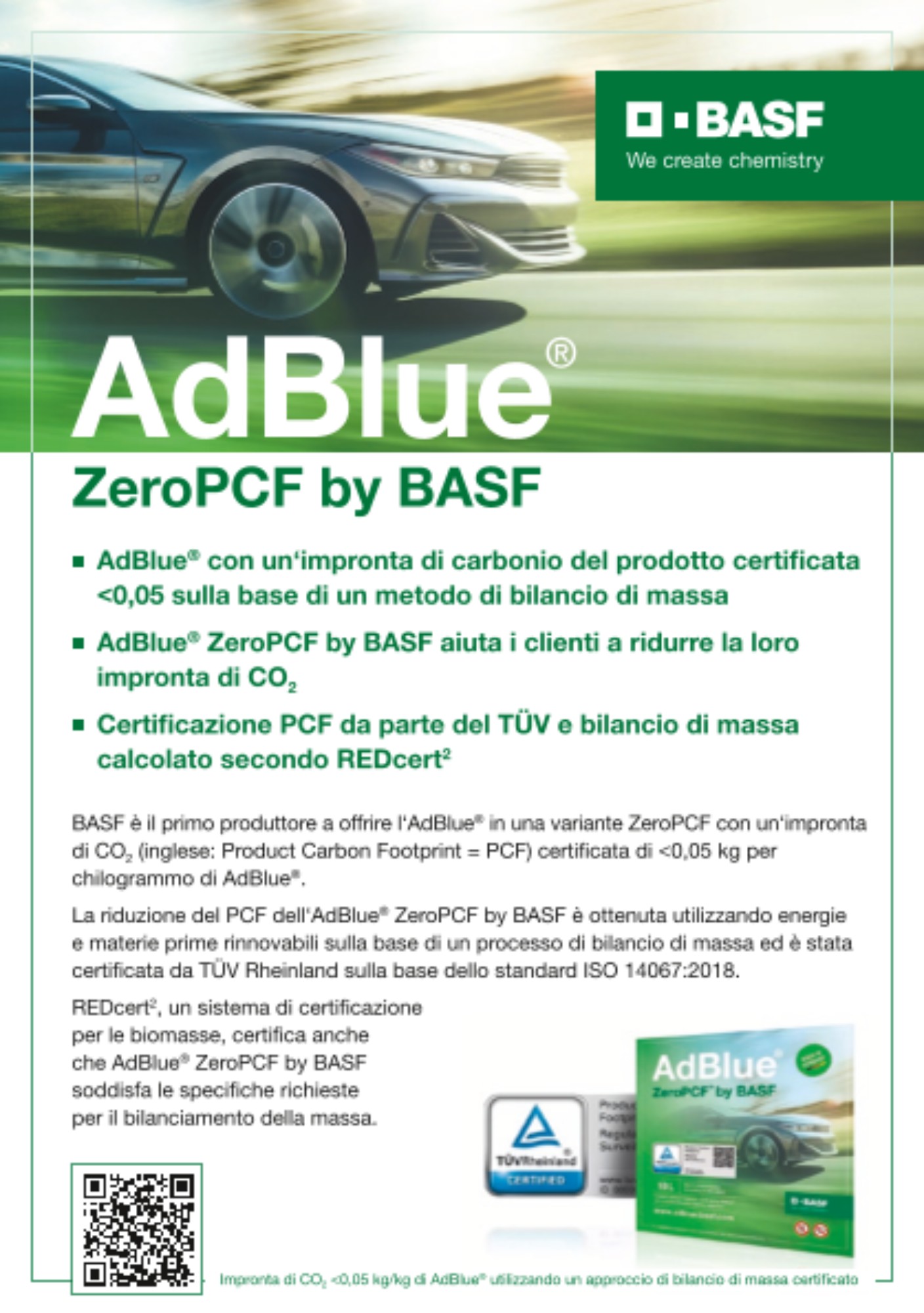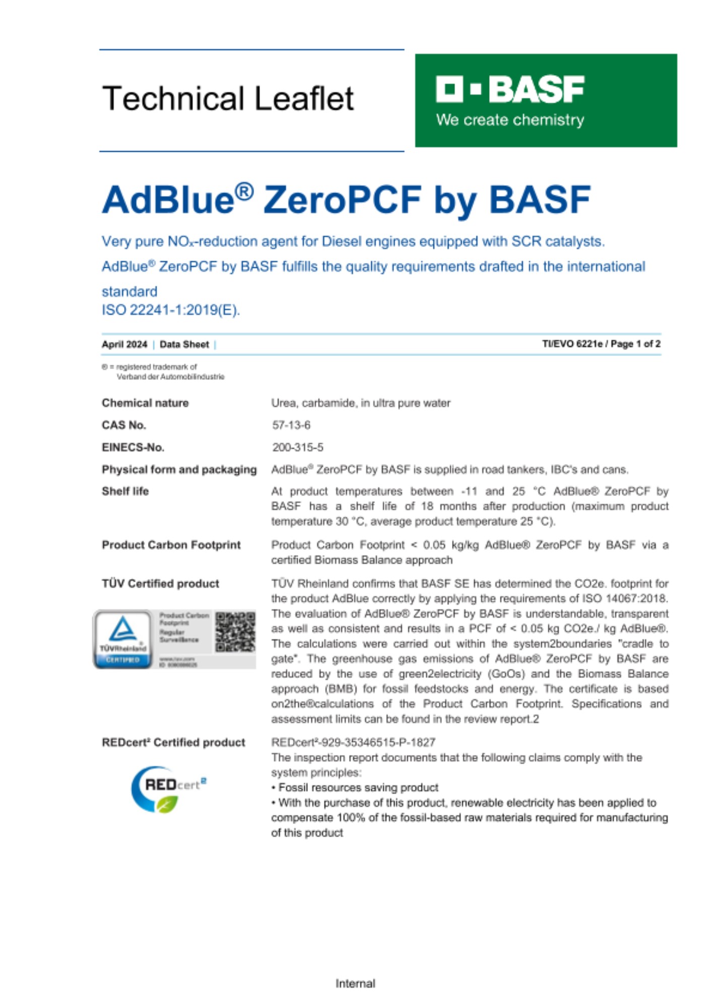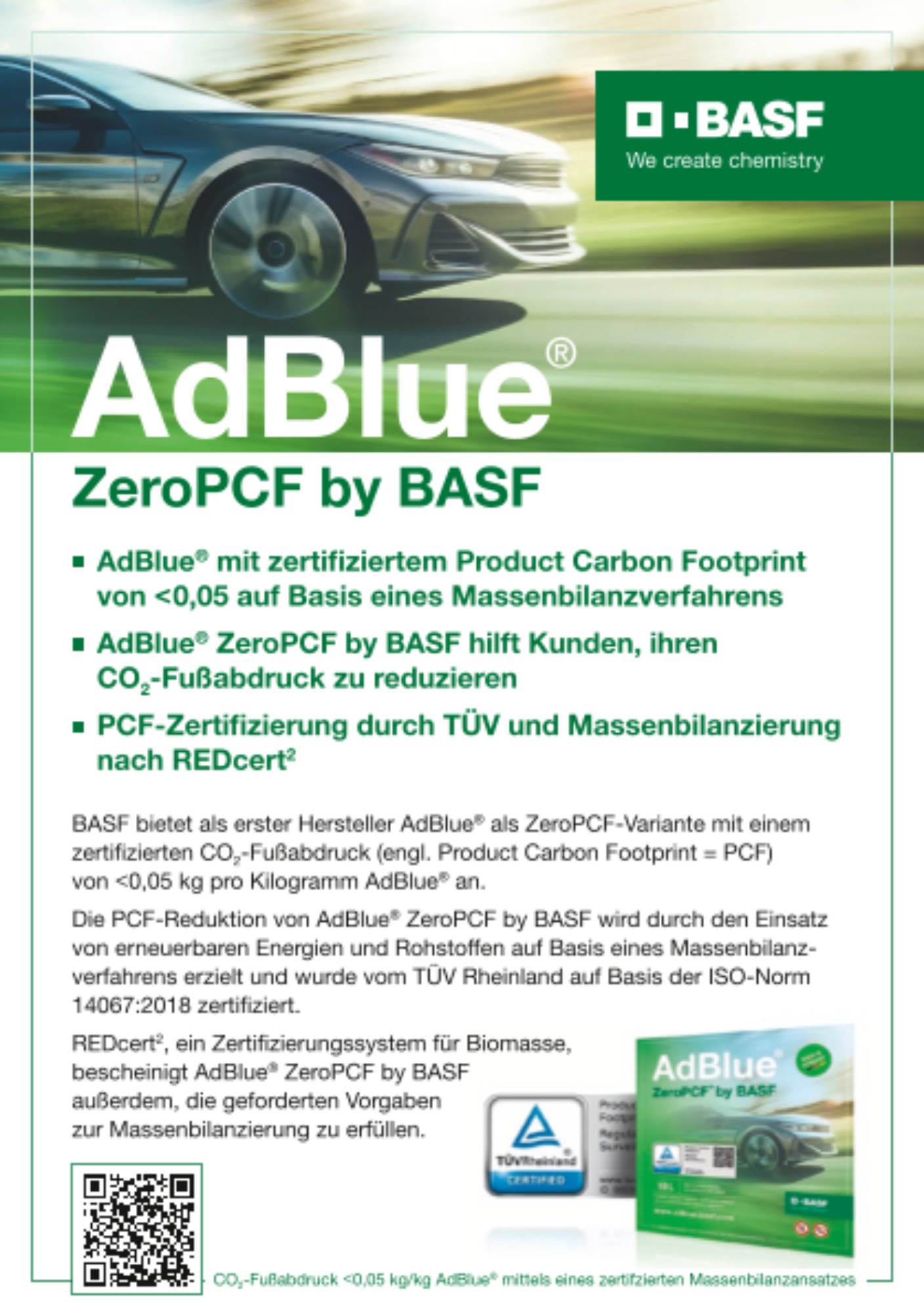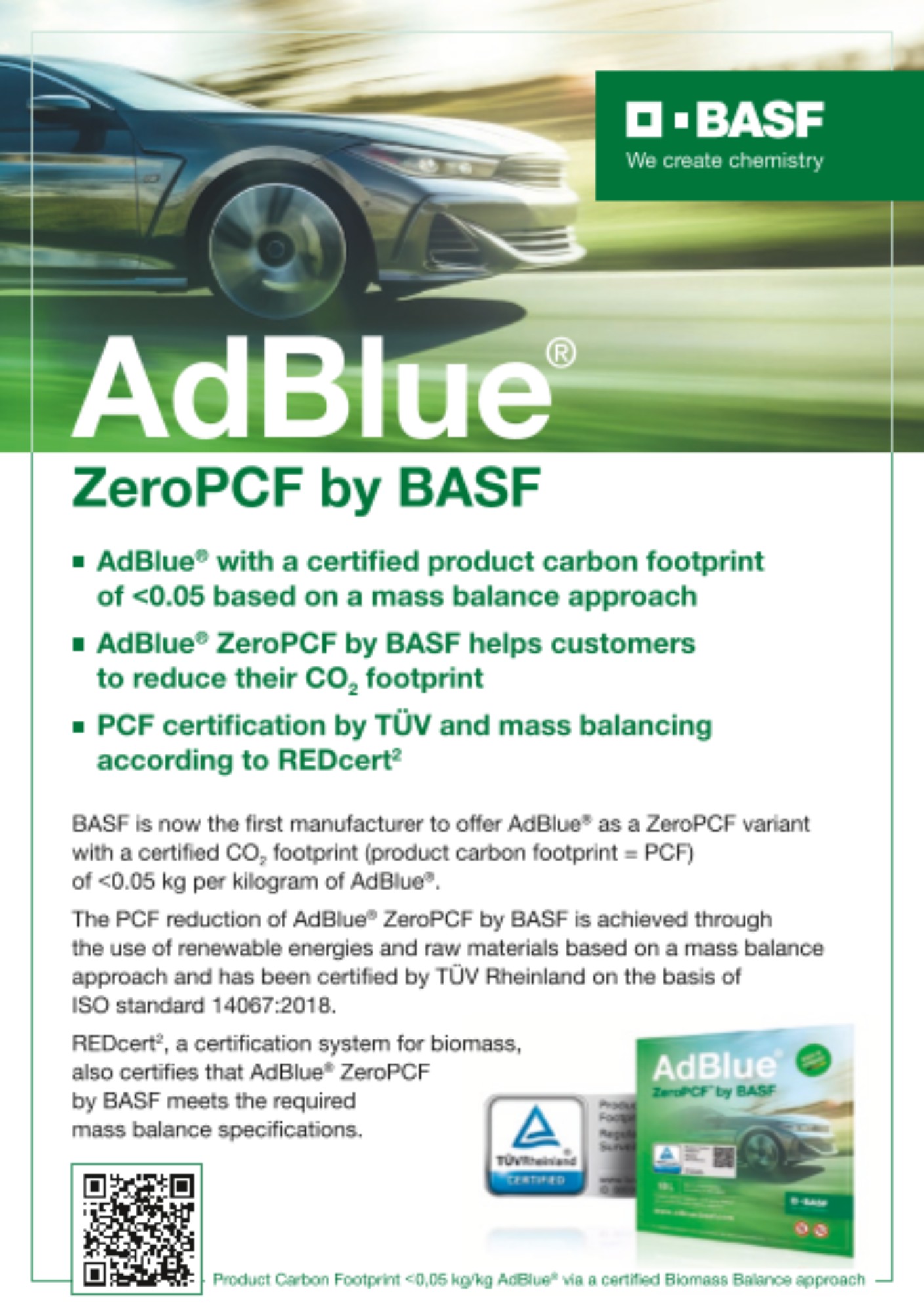 BASF bietet ab sofort als erster Hersteller AdBlue® als ZeroPCF-Variante mit einem zertifizierten CO2-Fußabdruck (engl. Product Carbon Footprint = PCF) von <0,05 kg pro Kilogramm AdBlue® an.