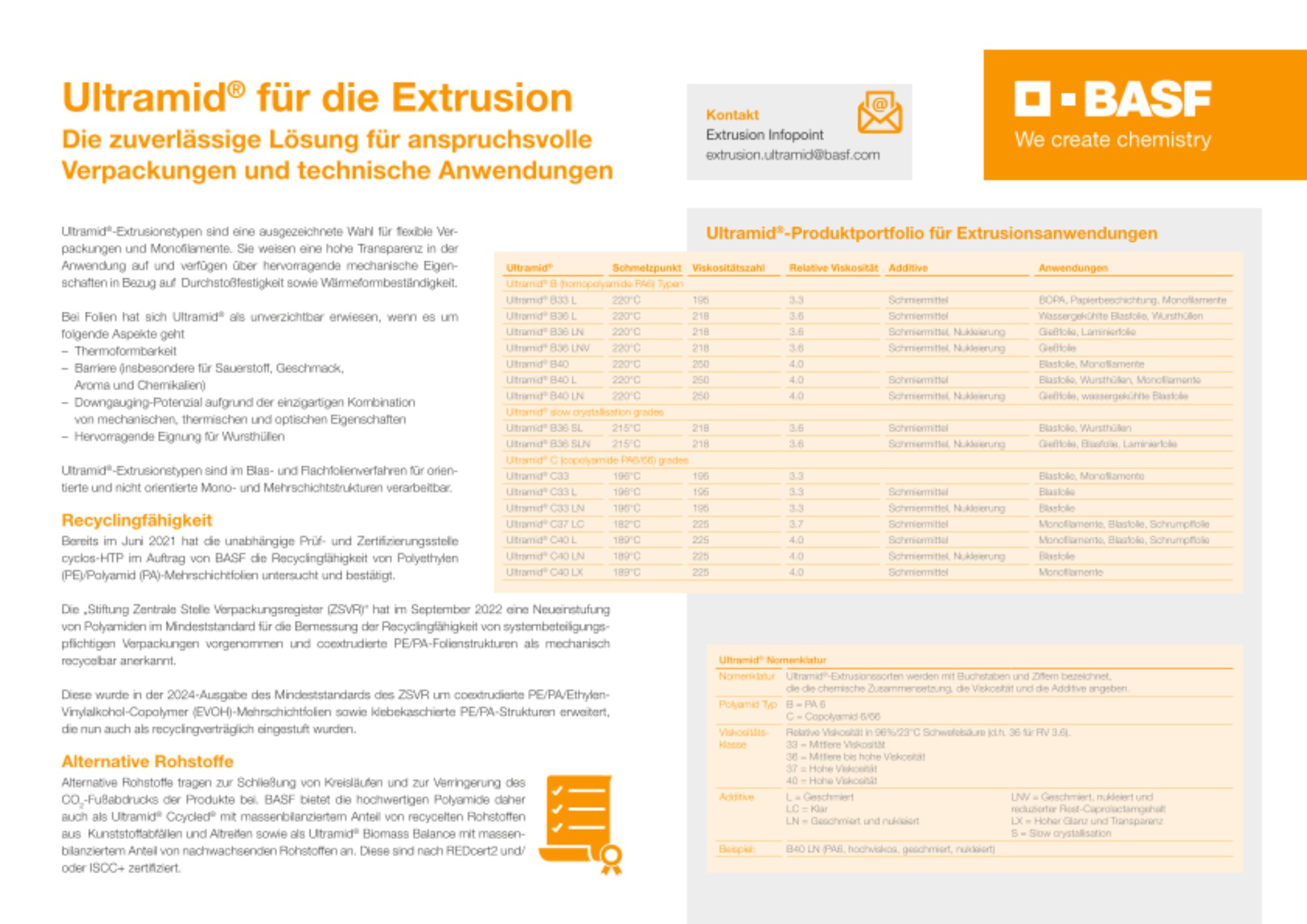 Ultramid®-Extrusionsmarken werden in den unterschiedlichsten Kombinationen von Viskosität und Additivierung angeboten. Ihre hervorragenden Eigenschaften machen sie unverzichtbar für transparente und flexible Lebensmittelverpackungen, medizinische Verpackungen, Monofilanwendungen (z. B. Angelschnüre, Fischernetze, Rasentrimmer) und Kabelummantelungen.