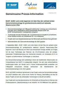 1. September 2022 – BASF, SABIC und Linde haben mit dem Bau der weltweit ersten Demonstrationsanlage für großtechnische elektrisch beheizte Steamcracker-Öfen begonnen. Durch die Nutzung von Strom aus erneuerbarer Energie anstelle von Erdgas hat die neue Technologie das Potenzial, die CO2-Emissionen eines der energie-intensivsten Produktionsprozesse der chemischen Industrie, um mindestens 90 % im Vergleich zu herkömmlichen Technologien zu reduzieren.