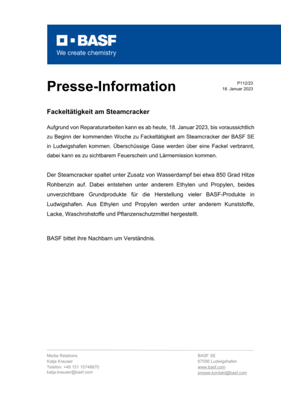 Aufgrund von Reparaturarbeiten kann es ab heute, 18. Januar 2023, bis voraussichtlich zu Beginn der kommenden Woche zu Fackeltätigkeit am Steamcracker der BASF SE in Ludwigshafen kommen. Überschüssige Gase werden über eine Fackel verbrannt, dabei kann es zu sichtbarem Feuerschein und Lärmemission kommen.