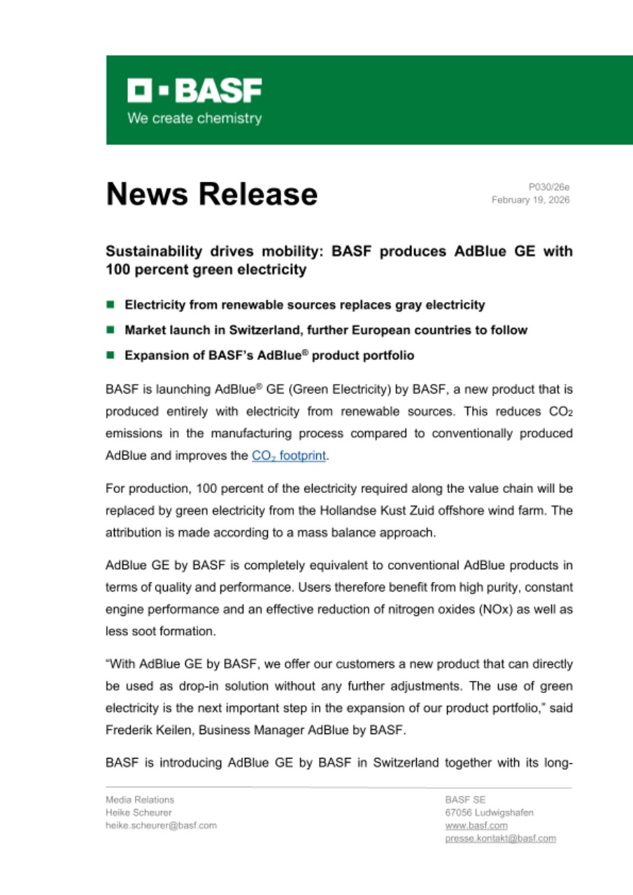 AdBlue® GE by BASF delivers the same proven performance as our standard AdBlue® – but is produced using 100% green electricity. This lowers CO₂ emissions in production and improves the cradle‑to‑gate footprint.