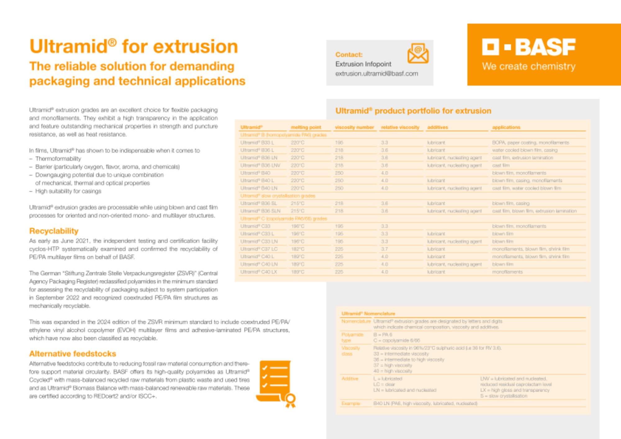 Our medium to high viscosity Ultramid® grades are the perfect choice for demanding applications in packaging, films, and monofilaments. Our Ultramid® extrusion grades provide exceptional strength and thermoformability, high heat resistance and very good barrier properties to gases, flavors, and aromas.