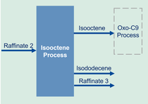 The SYNCRATM IOC process starts with the purification of the raffinate streams. The purified feed is then dimerized yielding a mixture of isooctene isomers, alongside minor quantities of isododecene and heavier olefins. Following dimerization, the product stream undergoes distillation to separate the desired C8 olefins from lighter and heavier fractions. The resulting isooctene achieves an exceptional purity and is highly reactive.