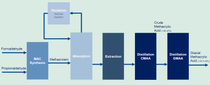 In the SYNCRATM MAA process, formaldeyhde (based on methanol) and propionaldehyde (based on ethylene) are first synthesized to form the intermediate methacrolein (MAC). Methacrolein is then further processed, including absorption, oxidation in a tubular reactor, extraction and distillation. The resulting crude methacrylic acid (CMAA, purity >98 wt%) is further distilled to give glacial methacrylic acid (GMAA) with a purity >99.5%wt, enabling usage in all relevant chemical applications.